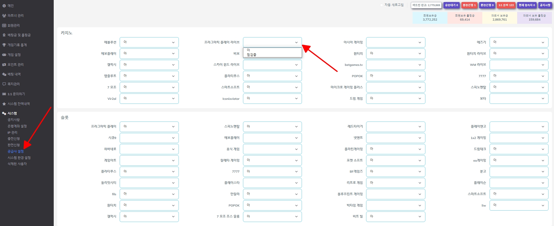메뉴판 시스템에 '공급사 설정' 탭을 통해 게임 공급사의 활성 상태를 수정할 수 있습니다.